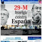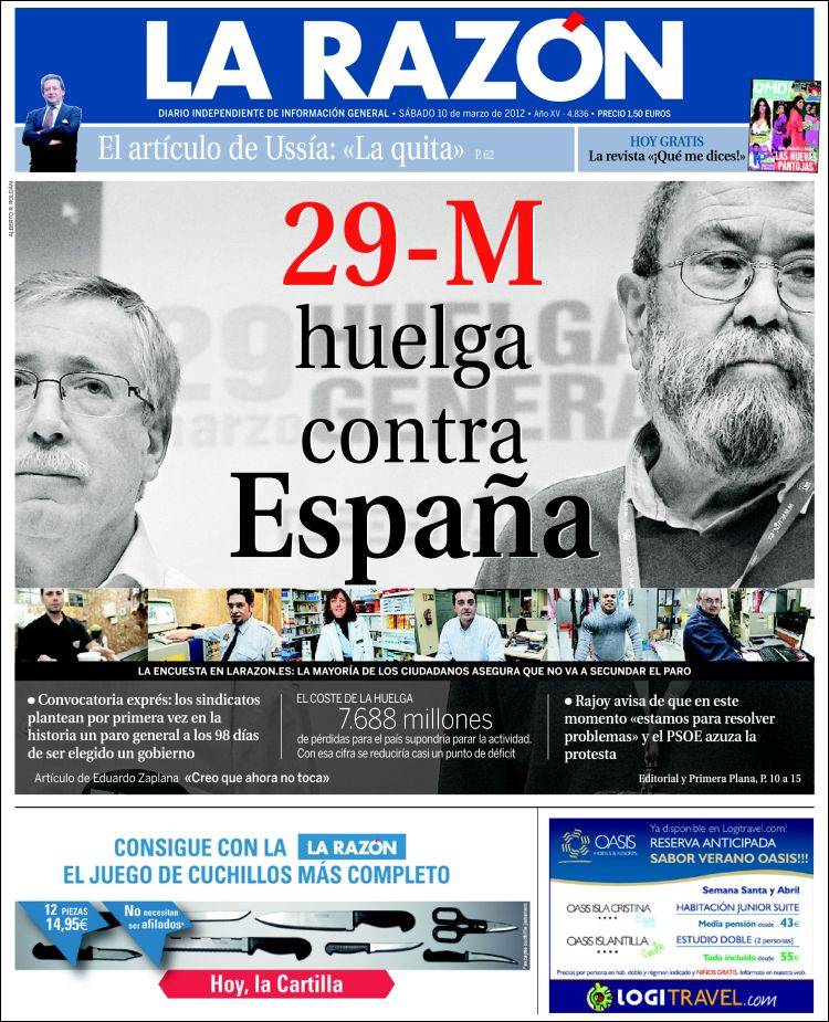 El diario ultraderechista de La Razón (“dime de qué presumes y te diré de qué careces”) ´en su edición del sábado 10 de marzo, titula en portada: “29M- Huelga contra España”.Esta es la idea patrimonial que la derecha tiene de España. Si la huelga general se hace contra un gobierno del PSOE, como se han hecho cuatro de las cinco que ha habido desde la transición, entonces la huelga es contra González o contra Zapatero. Pero si la huelga se hace contra un gobierno del PP, entonces la huelga es contra España. Porque ellos son España. O peor, porque España es de ellos. Con su pan se la coman.