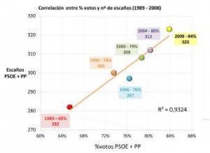La conversión de votos en escaños al bipartidismo es lineal como se deduce del análisis de las seis últimas citas electorales y puede verse en el gráfico.