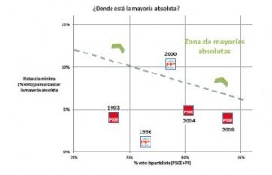 Como hemos dicho el escenario más probable es que PP y PSOE se repartan 309 escaños. La mayoría absoluta está en 176 escaños. Para que el Partido Popular alcance esa cifra el Partido Socialista debe lograr, a lo sumo, 133 escaños. Es decir, para garantizarse la mayoría absoluta, la ventaja del PP sobre el PSOE debe ser de 43 escaños lo que supone en la fórmula unos 8 puntos de distancia; siempre en el entorno del 78% de bipartidismo.