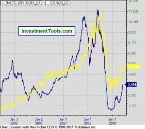 Si observamos detenidamente estos indicadores veremos que sus oscilaciones aportan más inquietud que esperanza.. En lo concerniente al moderado aumento del precio de los fletes marítimos se debe más al incremento del precio de las que al incremento del comercio,, de las exportaciones o de la demanda internacional (Gráfico 1). ¿Entonces por que suben ahora su precio las materias primas sin no hay un aumento del consumo y la demanda internacional? Por que las materias primas son un indicador matutino de tendencias económicas que luego serán dominantes. Se trata de indicadores muy sensibles a cualquier cambio (Gráfico 3).