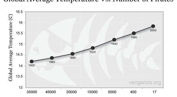 Puede que te interese saber que el calentamiento global , los terremotos , huracanes y otros desastres naturales son un efecto directo de la reducción del número de piratas desde 1800. Por su interés , he incluido un gráfico que establece la relación entre la disminución número aproximado de los piratas frente al aumento de la temperatura media mundial en los últimos 200 años. Como puede ver , existe una relación inversa estadísticamente significativa entre los piratas y la temperatura global .