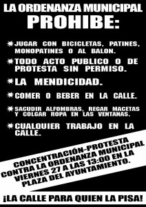 El pasado 10 de noviembre entró en vigor la normativa que pretende regular el uso del espacio (en teoría) público. La ordenanza prohíbe entre otras cuestiones tender la ropa, colgar pancartas, etc. en las fachadas de las casas, comer o beber en la calle (cualquier cosa), jugar a la pelota, patinar, escupir, etc. Además criminaliza la mendicidad, la prostitución, la venta ambulante, la música de calle, todo tipo de actos públicos no comunicados, etc. Todo ello, dada la ambigüedad de la ordenanza, deja en manos de los agentes de la autoridad distinguir lo que supone delito y lo que no.