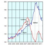 Ha sido la crisis la que ha provocado la deuda pública y no al contrario. Primero fue la crisis y luego vino, como consecuencia directa e inmediata, el aumento de la deuda pública. Esto es algo que se olvida a diario inmerso como estamos en esta bacanal de recortes sociales. La inversión del sentido de la causalidad entre crisis y deuda pública es pues una operación clave para legitimar el desmontaje del Estado del bienestar. Ni la sanidad o la educación pública, ni la investigación o el gasto en dependencia han ocasionado los agujeros de Bankia o el brutal déficit por cuenta corriente (privado) que tiene España. Son los agujeros de la banca y la deuda privad la que han forzado al Estado a endeudarse y ha disparado el déficit al disminuir drásticamente los ingresos fiscales por la recesión económica como se pude observar en el siguiente gráfico.