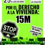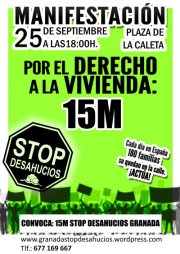 Ante esta situación de radicalización por parte de los poderes públicos, en los que se bloquean procesos democráticos de recogida de firmas en la mesa del Congreso, se extiende el uso de la fuerza policial ante concentraciones ciudadanas pacíficas que pretenden defender el derecho a la vivienda de las familias y a la aplicación sistemática de una ley hipotecaria que es a todas luces injusta, Grupo Stop Desahucios de Granada considera necesaria una respuesta firme y multitudinaria de la ciudadanía. Es por eso que se convoca a una manifestación el próximo 25 de septiembre a nivel nacional.