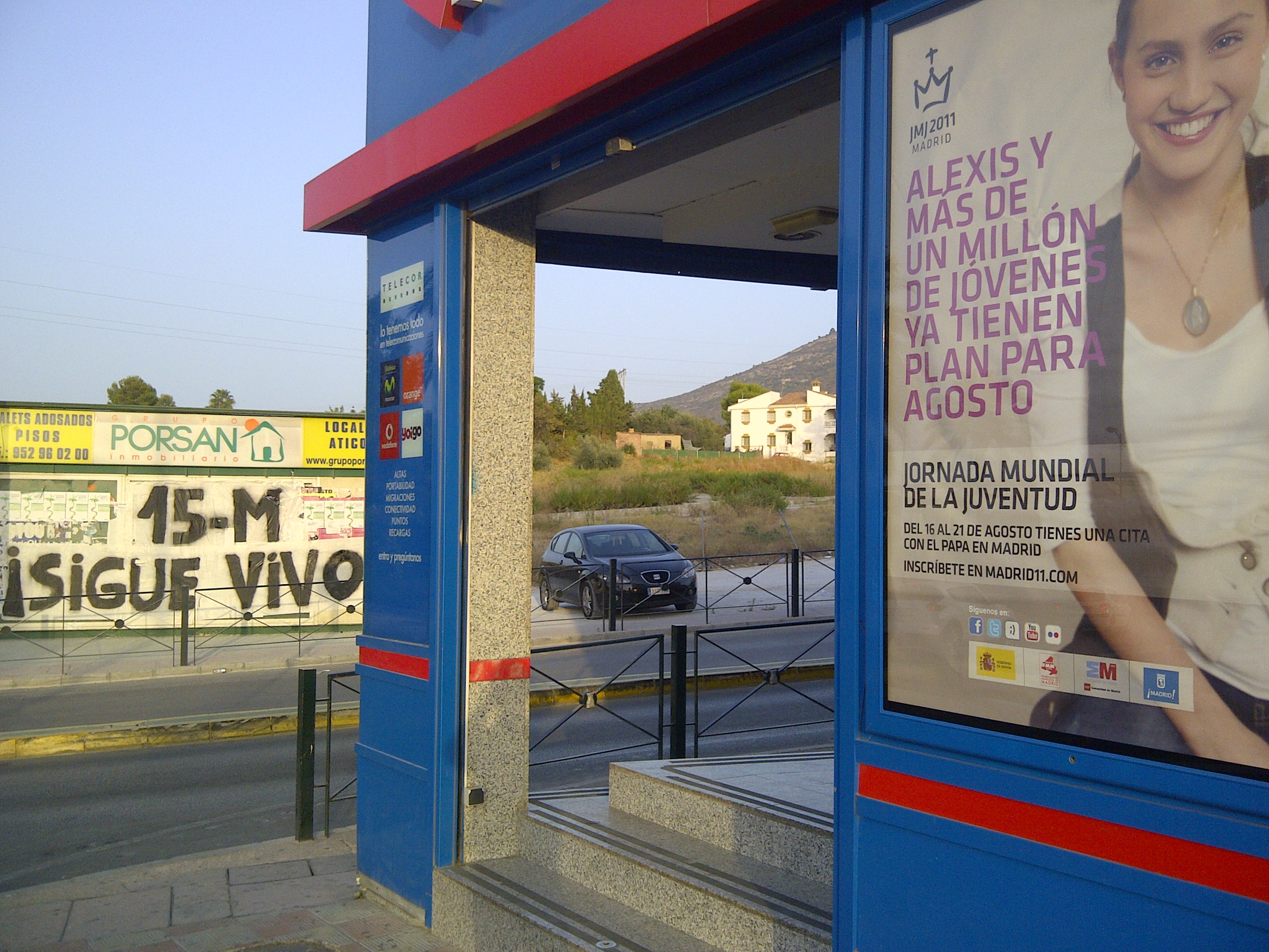 Como reza en la foto adjunta, el movimiento de los “indignados”, tres meses después de su nacimiento, está más vivo que nunca. Consiguiendo que en los medios, el parlamento y en algunas sedes políticas se hable de asuntos que hace solo unas semanas eran tabú, como la participación ciudadana, el control de las entidades financieras o la supresión de las diputaciones. Consiguiendo que familias que estaban siendo desahuciadas por los bancos conserven su casa y den sentido al articulo ese de la constitución que la califica como un derecho. Consiguiendo que un chaval que iba a ser deportado a un país donde probablemente acabarían con su vida, sea liberado y con el la esperanza de otros muchos. (Reconozco que ni yo mismo confiaba en ello cuando votamos en el pleno la declaración de apoyo y revisión de su expediente).(1)