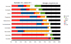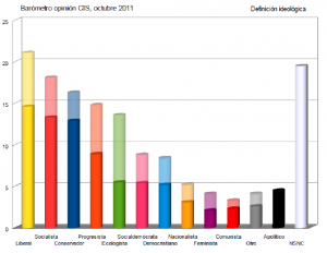 En el último barómetro de opinión del CIS (octubre de 2011) se incluye como cada trimestre una pregunta sobre con qué “etiqueta” ideológica se identifica más la persona encuestada. A diferencia de la escala izquierda/derecha, esta autoasignación ideológica tiene un valor más cualitativo; y puede ayudar a conocer mejor cómo somos políticamente hablando. Y a menos de un mes de las elecciones, creo interesante comentar algunos aspectos desde un punto de vista estrictamente descriptivo.
