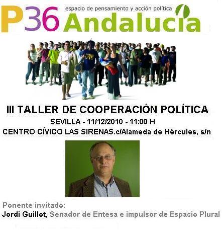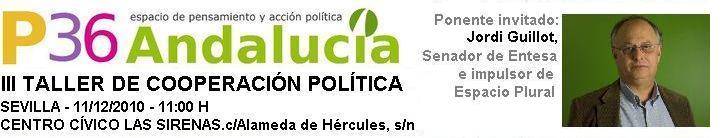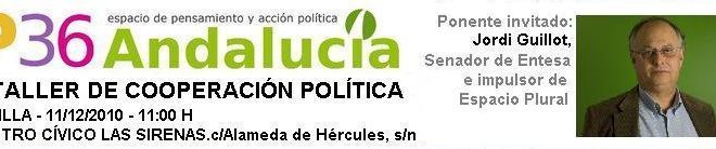El próximo Sábado 11 de diciembre de 2010, a las 11 h., en el Centro Cívico Las Sirenas (C/ Alameda de Hércules s/n), P36 Andalucía os invita al III Taller de Cooperación Política con la presencia de Jordi Guillot, Senador de Entesa e impulsor de Espacio Plural.