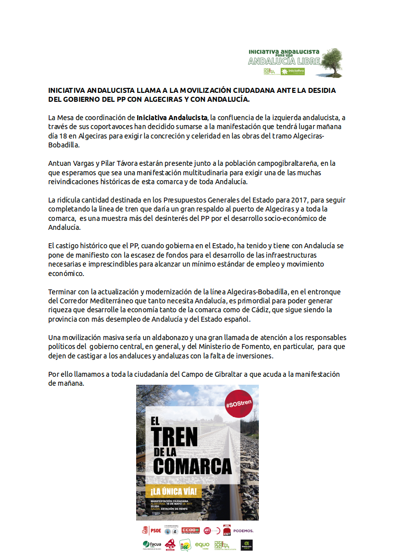 En un comunicado público la confluencia de la izquierda andalucista ha mostrado su apoyo a la manifestación del día 18 de mayo en Algeciras.