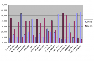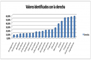 El ecologismo, el feminismo y la igualdad, lo que menos. El capitalismo, el autoritarismo y la tradición, los valores más asociados. Como se ve son valores vinculados con la desigualdad, la eficacia económica, con el orden y el mundo tradicional los más asociados a la derecha. Esta es vista muy lejos de los valares modernos y con un débil componente ético. Hasta el liberalismo es más asociado a la izquierda que a la derecha.