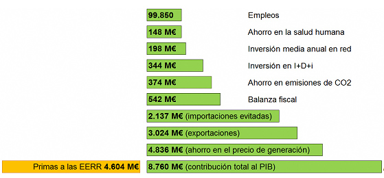 Las primas que reciben las energías renovables alcanzaron los 4.604 millones de euros. Las importaciones de combustible evitadas gracias a las energías renovables superaron los 2.137 millones de euros y el ahorro en emisiones evitadas superó los 374 millones de euros. Además, como las energías renovables entran a precio cero en el mercado eléctrico, desplazando a tecnologías de generación de coste marginal mayor y abaratando, permitieron un ahorro en el mercado eléctrico superior a los 4.835 millones de euros.