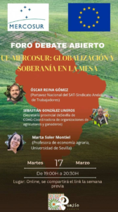 El pasado 17 de marzo, el colectivo Quejío Andalú organizó una mesa de debate centrada en el Acuerdo UE-Mercosur, un tratado que genera creciente preocupación entre sectores agrarios, sociales y ecologistas. El encuentro reunió a distintas voces del ámbito rural, sindical y universitario para analizar sus consecuencias sobre Andalucía y el modelo productivo actual. Participaron Sebastián González, secretario provincial de Sevilla de la Coordinadora de Organizaciones de Agricultores y Ganaderos (COAG); Óscar Reina, portavoz nacional del Sindicatos Andaluz de Trabajadores (SAT); y Marta Soler, profesora de Economía Agraria de la Universidad de Sevilla.