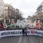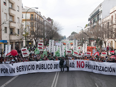 En la cabecera, junto a los líderes de los sindicatos CSIF, Ustea y Safja (parte de cuyo discurso ha corrido en ocasiones paralelo al del PP), estaba Diego Cañamero, líder del SAT, sindicato izquierdista. Disimulado entre el gentío sonreía Juan Manuel Sánchez Gordillo, emblema de la izquierda sin concesiones. Ondeaban decenas de banderas de CGT y la Unión Sindical Obrera. Jóvenes de plataformas sociales repartían octavillas e improvisaban tenderetes para vender libros de Marx.
