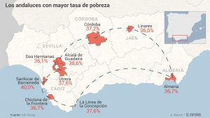Dicho documento, redactado por la consultora AIS Group en base a 1.300 indicadores de consumo, lo suscriben 49 entidades. Desde Cáritas hasta Acción contra el Hambre o La Obra Social de La Caixa. En él se detalla que nueve de las diez localidades españolas con mayor riesgo de que su población caiga en la extrema pobreza están en Andalucía.