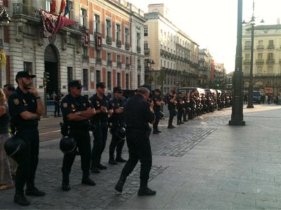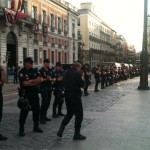 Nos despedimos de parte del grupo en la misma plaza. Seguimos adelante hacia Sol, entramos en la plaza. Vuelvo a sentir la emoción de los primeros días de mayo. Nos quedamos en Puerta de Sol, hablando con gente, bailando con las batucadas, siguiendo a la policía a ritmo de Cunga cuando la vemos correr en fila y posicionarse en calle Montera. Todo en un ambiente festivo, pacífico. Subimos hacia Alcalá, divisamos Cibeles cuando nos topamos con la Policía. Sólo nos dejan pasar sin «cartelitos» del 15M. Están claramente protegiendo a los peregrinos que corean a gritos «Viva el Papa!» mientras cenan en el VIPS. Observamos a ciudadanos y ciudadanas indignados por no poder pasar sin el visto bueno de la policía. -«Cuidado porque los peregrinos estos saben que están protegidos y van provocando, pero si les respondes, te detendrán a ti, no a ellos», nos dice una mujer en la calle Alcalá.