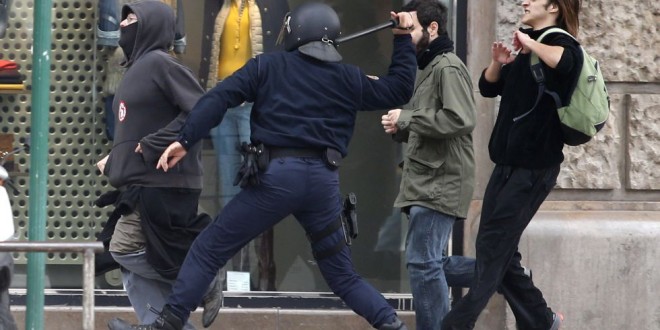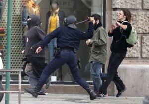 El policía marca los movimientos reglamentarios de su brutalidad. El chico que huye cumple con su deber de eludir el golpe. Detrás, a muy pocos pasos, un muchacho presiente el dolor del golpe y contrae el gesto, mientras que otro trata de evitar lo peor, que le toque a él. De nuevo sangre y humo por las calles. Este gobierno de estúpidos registradores de la propiedad le ha declarado la guerra a la gente, sin saber muy bien por qué, aunque sí para qué. Como decía Kafka ya no hay milagros sólo manuales de instrucción. Quieren prohibir que veamos estas fotografías por qué `piensan repetir la escena y aun empeorarla (lo cual es lamentablemente posible). Pero lo más inquietante es ese maniquí de la foto que ni se inmuta. El policía está en lo suyo, un pobre desgraciado al que le han dado un palo para que le de palos a los pobres. Los que corren y huyen también pero, ese maniquí que no se inmuta… ¿ a quién representa?